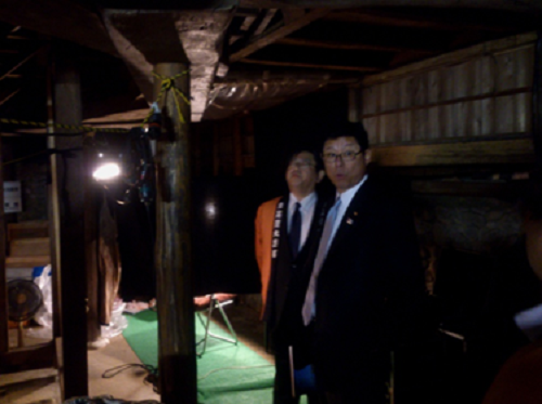 旧金比羅大芝居(金丸座)の舞台下で舞台装置の説明を受ける高木副大臣