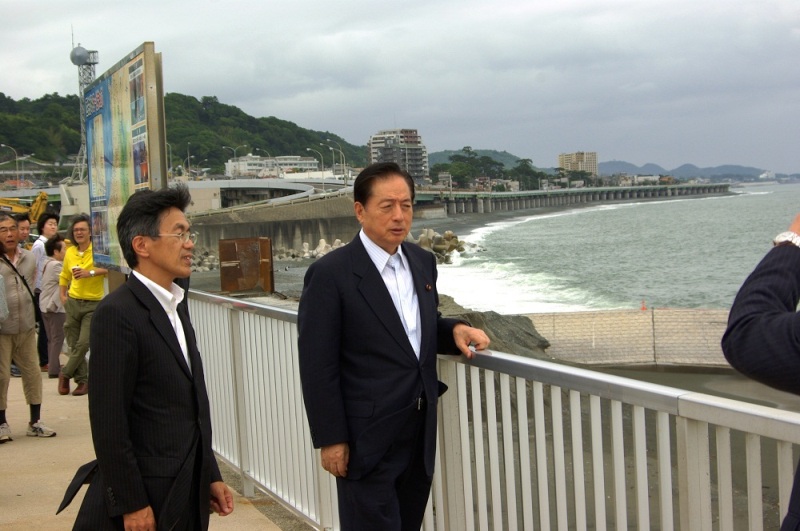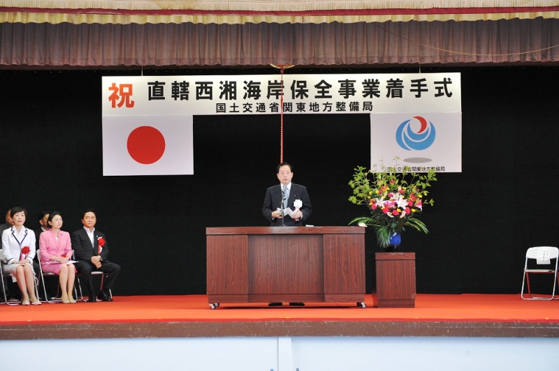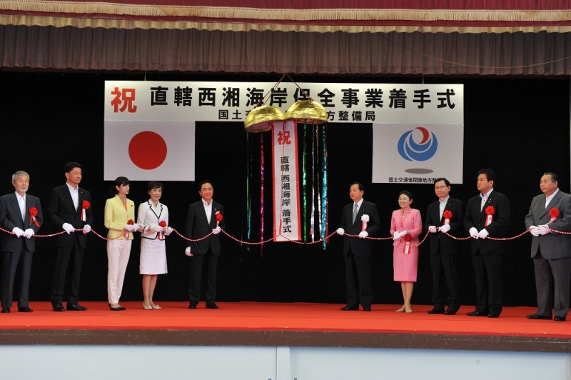 太田国土交通大臣は、6月8日、神奈川県二宮町で行われた「直轄西湘海岸保全事業着手式」に出席し、直轄西湘海岸の視察を行いました。 着手式主催者として挨拶した太田大臣は、「南海トラフや相模トラフ等の巨大地震・津波への対策を進める必要があり、西湘海岸の早期完成に向け最大限の努力をする」と述べました。