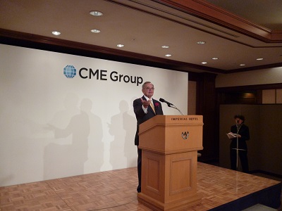 7月1日、午後7時より CMEグループ主催による、レオ・メラメド名誉会長の来日記念レセプションが開催され、木原外務政務官および高木副大臣から歓迎の挨拶、山縣港湾局長が乾杯の発声を行いました。