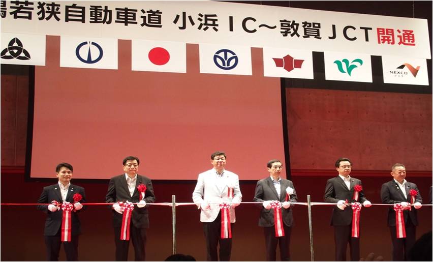 高木副大臣は、平成26年7月20日(日)に福井県美浜町で行われた「舞鶴若狭自動車道(小浜インターチェンジ~敦賀ジャンクション)開通式」に出席しました。 高木副大臣は、冒頭の挨拶で 「舞鶴若狭自動車道 小浜~敦賀間39kmの開通により、北陸道・名神・中国道・舞若道による358kmの北近畿環状高速ネットワークが完成し、太平洋側の代替ルートとして、日本にとっても大変意義のある道路がいよいよ完成した。」と述べるとともに「舞若道が大いに利用され県内の交流が進み、県全体が発展することを期待したい。」と述べました。