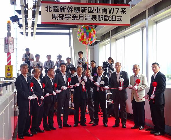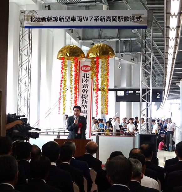 平成26年8月5日(火)、野上副大臣は、新高岡駅と黒部宇奈月温泉駅で行われた「北陸新幹線W7系新型車両歓迎式」に出席し、祝辞を述べました。