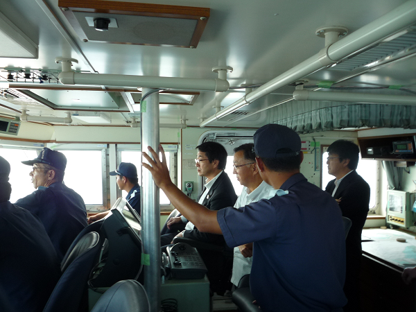 巡視船「みずき」で石垣港内を視察する中原大臣政務官