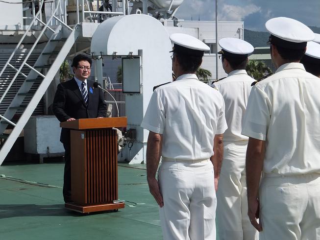西村副大臣は、9月24日(水)、石垣海上保安部(巡視船はてるま)と石垣航空基地を訪れ、「尖閣諸島等の領海警備を現場第一線で、冷静かつ理性的に毅然とした態度で、365日昼夜分かたず職務に精励されていることに感謝します。今後、さらに領海警備に万全に臨めるよう体制を整備いたします。皆さんも健康に留意し、無事故でその任務を果たすようお願いします。共に頑張りましょう。」と激励しました。