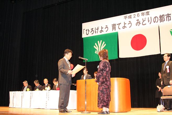 平成26年10月29日(水)、東京都港区虎ノ門、日本消防会館(ニッショーホール)で、都市緑化月間(10月)の中央行事である、平成26年度「ひろげよう 育てよう みどりの都市」全国大会が開催され、うえの政務官が出席し、祝辞を述べるとともに大臣表彰を行いました。