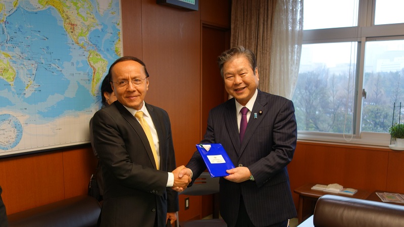 平成27年3月19日(木)、国連防災世界会議で来日中のエルサルバドル共和国マルティネス公共事業・運輸・住宅都市開発大臣が、北川国土交通副大臣を表敬訪問されました。