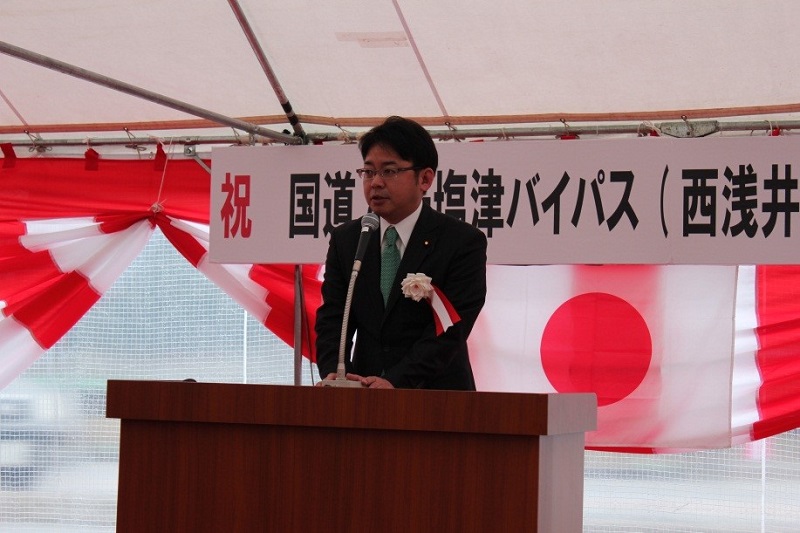 うえの国土交通大臣政務官は挨拶で「国道8号は関西と北陸を結ぶ主要な幹線道路であり、多くの経済交流、地域のみなさんの足として、これまでも十分に活用されて参りましたが、県の北部に関しては、雪が多く、川も多い。そうした中でバイパス化の要請が非常に強く、本日無事に開通できますことに感謝を申し上げたい。滋賀県北部は東海・北陸・関西の結節点として大変重要な地域であり、インフラをしっかり整備し、経済活力の発展あるいは地域のみなさまの利便性の向上に努めてまいりたい。」と述べました。