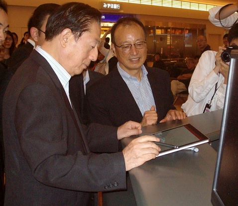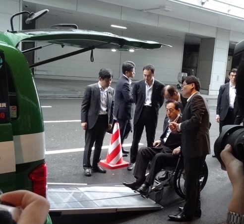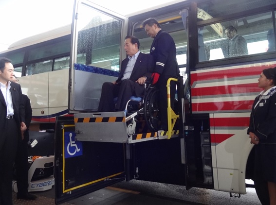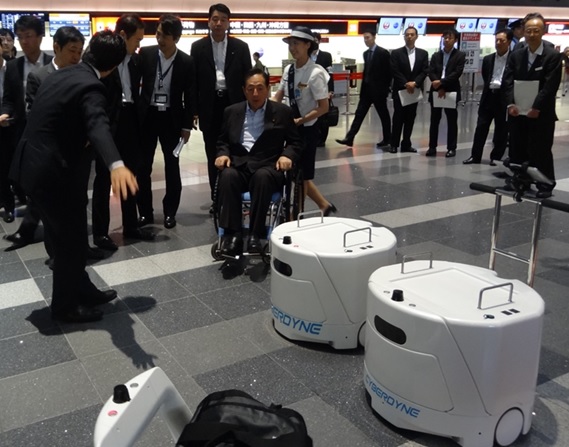 太田大臣は、9月9日(水)に鈴木政務官、青木政務官とともに羽田空港を訪問し、実装型ロボットの視察、リフト付きバスとユニバーサルデザインタクシーに乗車、情報バリアフリーシステムの視察等を行いました。太田大臣は視察後、「東京を先進的な都市にし、それを足がけに全国へ、人に優しい街を広めていきたい」旨、述べました。