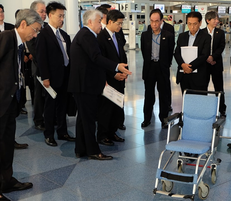 (駅を含めたターミナル全域で使用できる統一規格の車椅子の視察)