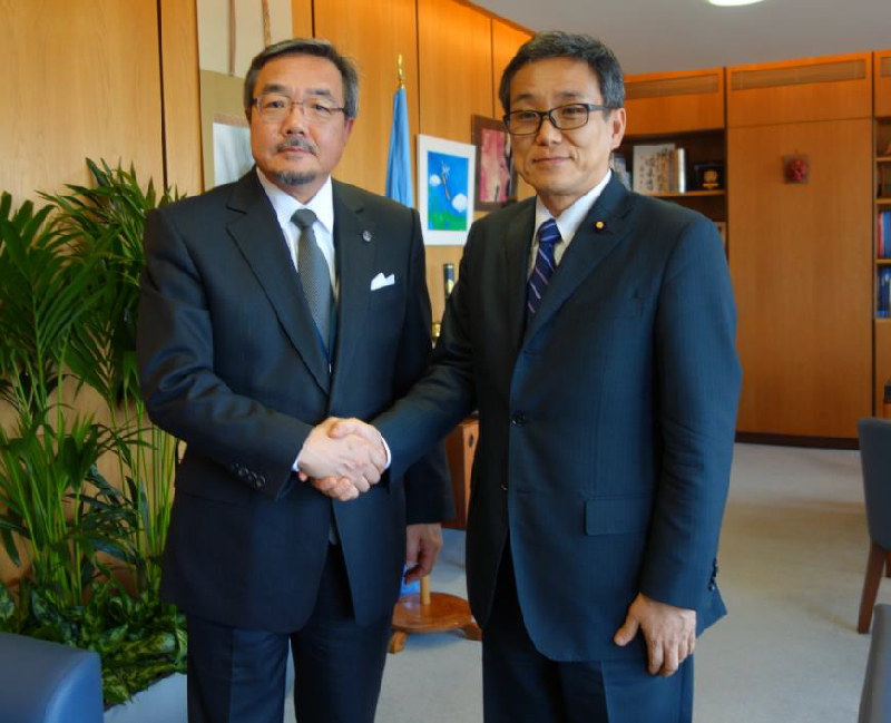 11月23日、江島潔国土交通大臣政務官は、IMO本部(英国・ロンドン)において、関水康司IMO事務局長と会談し、本年末に4年間の任期満了をもって退任する関水氏の長年にわたるIMOに対する功労をねぎらうとともに、引き続き我が国がIMOの活動に積極的に取り組む決意を表明しました。