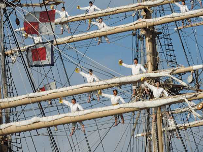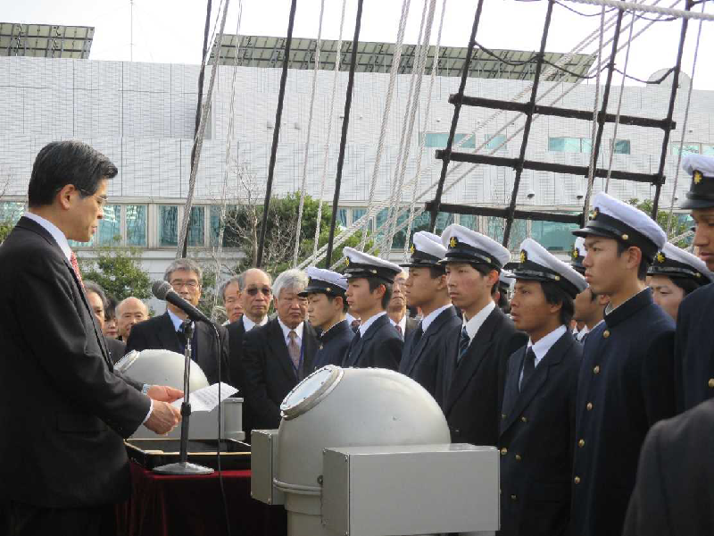石井大臣は、12月12日、横浜港で行われた独立行政法人航海訓練所 練習帆船「日本丸」遠洋航海出航式において、実習生に対し訓示を行い、登しょう礼を視察しました。