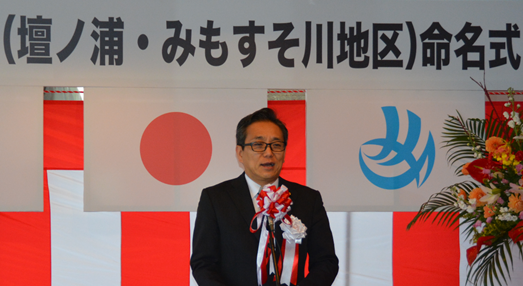 江島政務官は挨拶の中で「本事業は地域の住民・企業の皆様を災害から守ることを目的に平成20年から取り組んでいる。今回の部分供用により、海岸線の防護だけでなく、遊歩道や自転車道等でこの海岸線が国民に広く親水空間として開かれたことを大きくアピール出来る。引き続き、国民の生命と財産を守り、安全と安心を守るインフラづくりに邁進努力していく」と述べました。