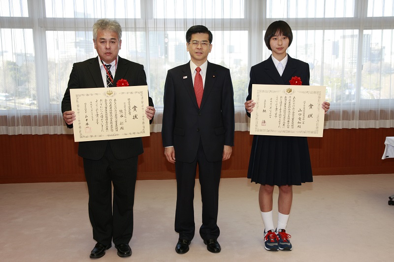 ※ 国土交通大臣賞受賞者の熊谷彩さんは、あいにく表彰式当日は欠席のため、沖野教頭先生が代理出席されました。