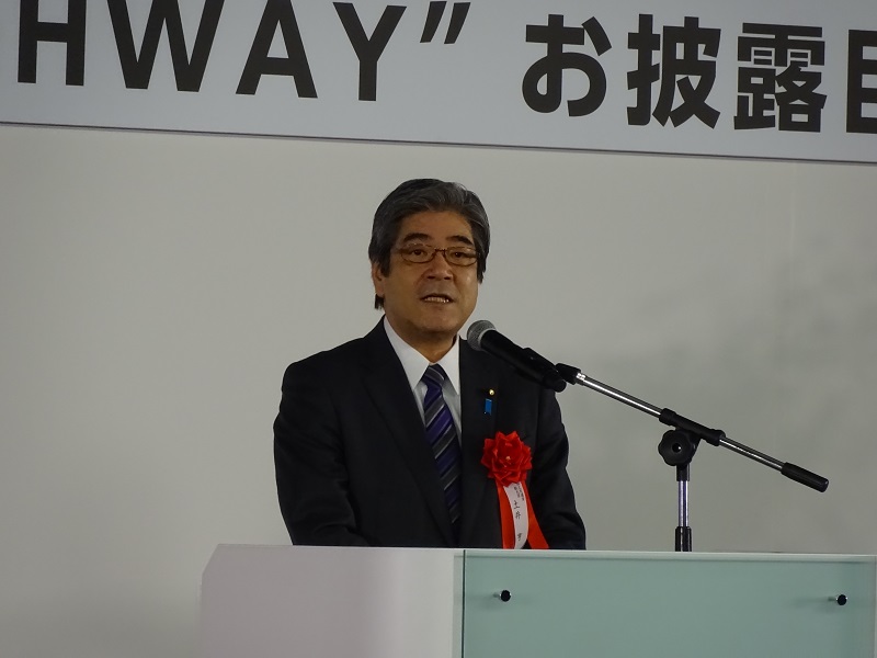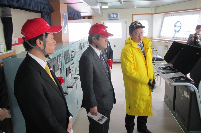 土井副大臣は、お披露目式に出席し、世界最先端の環境技術によって本船を建造されたことは、我が国の海運会社の環境保護に対する積極的な取組姿勢や我が国の海事クラスタ―の総合力と高い技術力を国内外に広く示す、大変意義のあることであり、また、今回のような式は、次世代の海事産業を担う子供たちをはじめ、多くの方が、最新の船に間近で接し、海事産業や海について理解を深めることのできる貴重な機会となる旨、述べました。