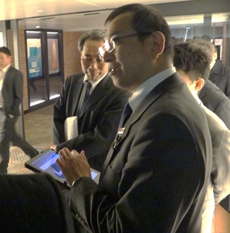 タブレットの画面上で現在地(屋内)を確認している津島政務官