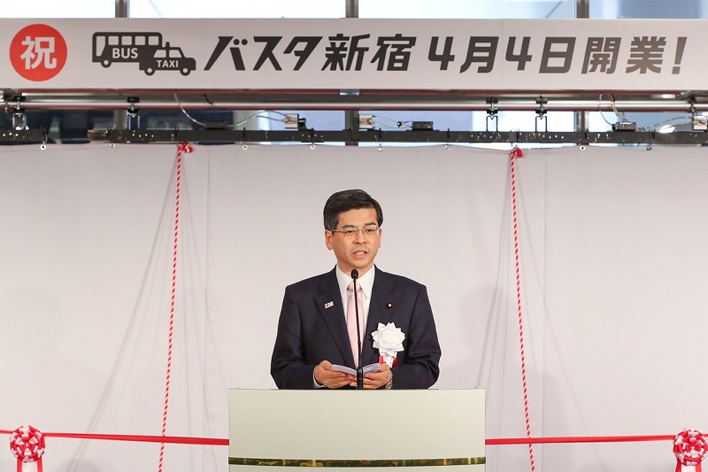 セレモニーにおいて石井国土交通大臣は、「今回オープンするバスタ新宿は、新宿駅周辺に分散する19箇所の高速路線バスの発着場を1箇所に集約し、1日約1600便が発着する日本最大のバスターミナルとなります。バスタ新宿は、全国の観光情報を提供する拠点としての設備も兼ね備えており、『観光先進国』を目指す取り組みにも大きく貢献するものと期待しております。」と述べました。