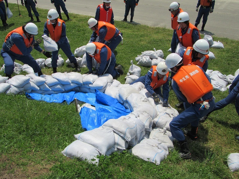 演習には国土交通省のほか、茨城県、取手市、警察、消防団・水防団、自衛隊など関係機関に加え地元企業や小学校から大学まで幅広い世代が参加し、参加者と見学者をあわせて約14,000人が来場されました。決壊しそうな堤防を守るための水防工法、避難に結びつく情報伝達訓練、救出・救護訓練、住民避難訓練など、関係機関と連携した総合的かつ実践的な訓練を実施しました。