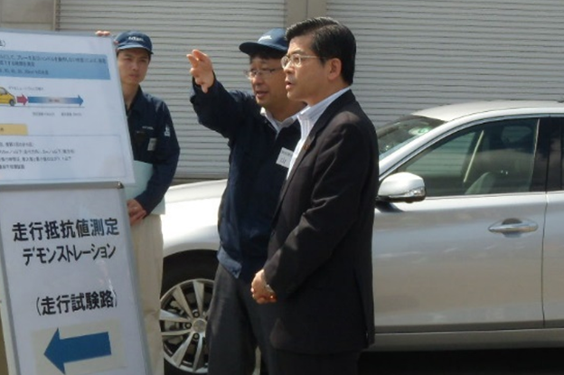 惰行法による走行抵抗値の測定について説明を受ける石井大臣