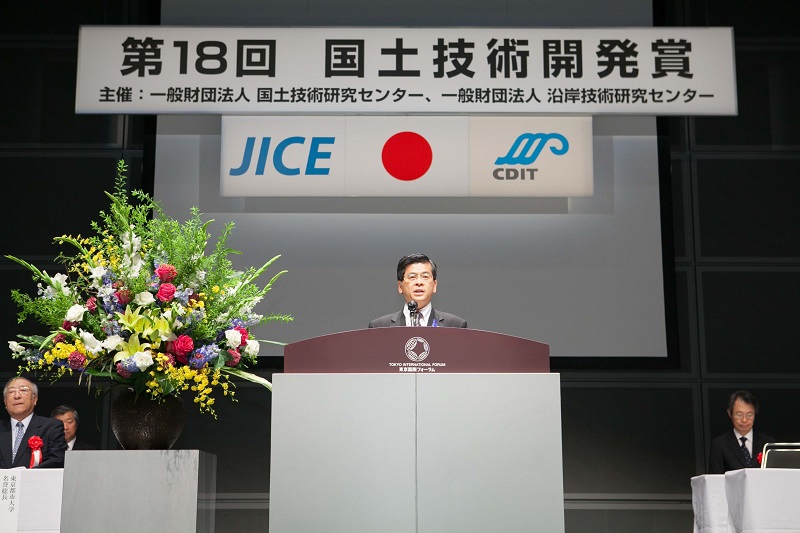 平成28年7月26日(火)、東京国際フォーラム(東京都千代田区)で行われた「第18回国土技術開発賞」の表彰式に、石井大臣が出席しました。 国土技術開発賞は、建設産業における広範な新技術を対象として、技術開発の効果、汎用性、新規性等の観点から特に優れるものを国土交通大臣が表彰するものです。 表彰式では、石井大臣より、最優秀賞の1件をはじめ、受賞技術7件に対し表彰状及び副賞が授与されました。