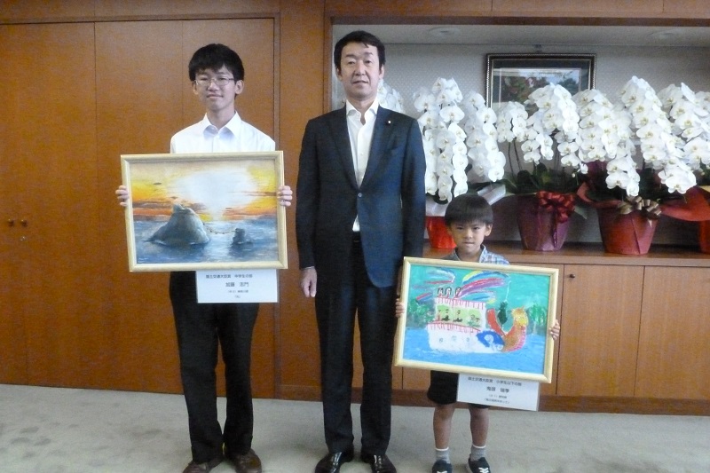 平成28年8月19日(金)、海に関する絵画コンクール「我ら海の子展」において、「国土交通大臣賞 小学生以下の部」を受賞した愛知県名古屋市立東桜小学校1年鬼頭瑞季さん、「国土交通大臣賞 中学生の部」を受賞した神奈川県横浜市立戸塚中学校2年加藤志門さんに対して、田中良生副大臣より表彰状を授与しました。