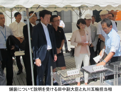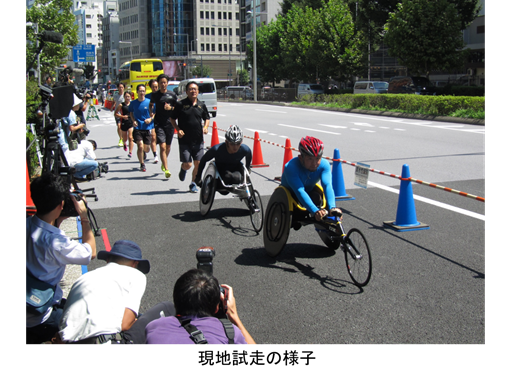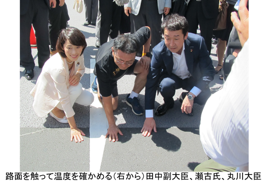 この試走会では、路面温度の上昇を抑制する保水性舗装及び遮熱性舗装について、元オリンピックマラソンランナーの瀬古利彦氏や元パラリンピックマラソンランナーの花岡伸和氏らが、これらの舗装を施した道路を試走し、従来の舗装との違いを確かめていただきました。