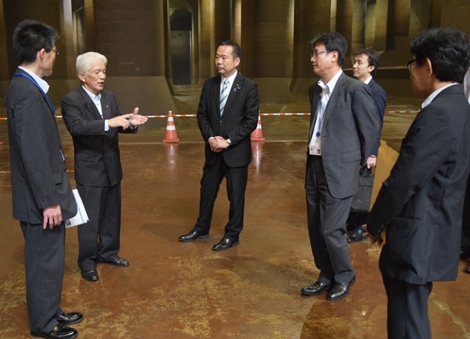 ▲調圧水槽にて外郭放水路の構造や効果等について説明を受ける藤井政務官