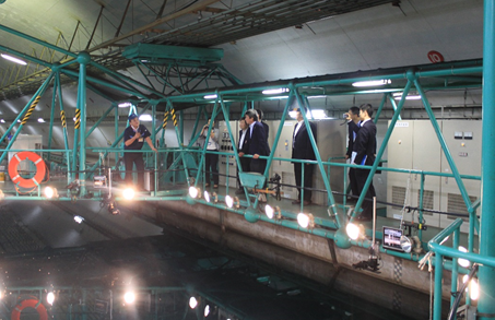 海事産業の生産性革命(i-Shipping)に向けた研究活動状況のほか、船舶の性能評価や海難事故の原因究明に用いられる400m試験水槽、実海域再現水槽及び操船リスクシミュレーターを視察しました。