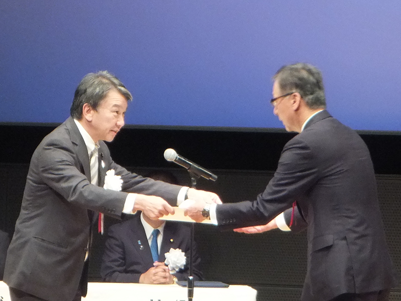 のオープニングセレモニーである記念式典において、国土交通分野における情報化の促進に貢献した次の3企業等に対して、大野泰正大臣政務官から表彰状が授与されました。