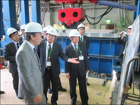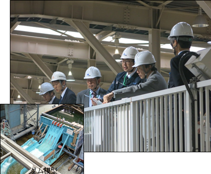 30MN大型構造部材万能試験機、輪荷重走行試験機では、土木研究所 金澤橋梁構造研究グループ長から試験機の説明、及び研究内容の説明を受け、実際に試験機を動かした状況を視察しました。水理実験施設では、土木研究所 佐々木水工研究グループ長より施設について説明があり、実験中のダム模型を視察しました。