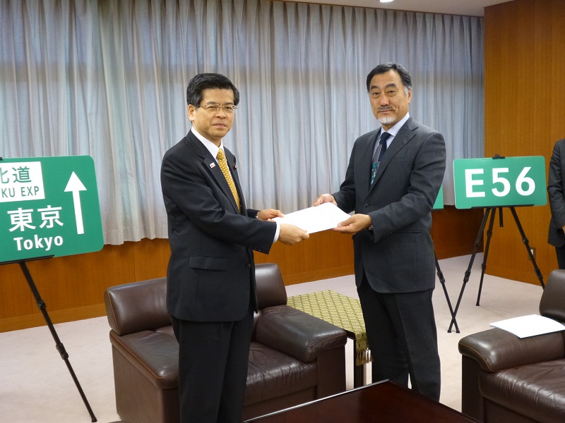 訪日外国人をはじめ、すべての道路利用者にわかりやすく道案内するため、検討を重ねてきた高速道路ナンバリング検討委員会の「高速道路ナンバリングの実現に向けた提言」が、家田仁委員長(政策研究大学院大学教授)から石井啓一国土交通大臣に対して手交されました。