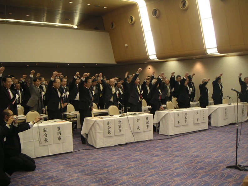 頑張ろう三唱で気勢を上げる市町村長の皆さん