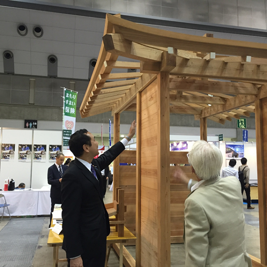 式典出席のあと、同会場で開催中の「第38回ジャパンホームショー」について、同連合会の出展ブース等を視察しました。本展は、我が国の住宅関連産業の発展拡大と、住生活の質的向上を図ることを目的として住宅建材・部材、住宅設備、住宅生産技術・工法を一同に展示するもので、この分野では我が国最大級の展示会です。