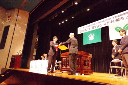 石井大臣は、都市の緑を次の世代に残すことが私たちの大きな責務であり、緑を守り育てる活動に期待を寄せている旨、祝辞を述べるとともに、緑豊かな都市づくりについて功績が認められた大臣表彰受賞者等の皆様に自ら賞状を手渡しました。