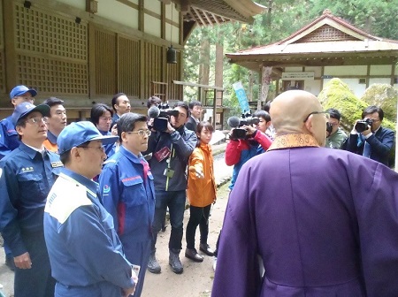 三徳山三佛寺で被災状況の説明を受ける石井大臣