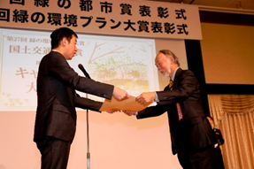表彰式では、田中副大臣より「緑の都市賞」内閣総理大臣賞を受賞した1組及び国土交通大臣賞を受賞した3組、ならびに「緑の環境プラン大賞」国土交通大臣賞を受賞した2組に対し、表彰状が授与されました。