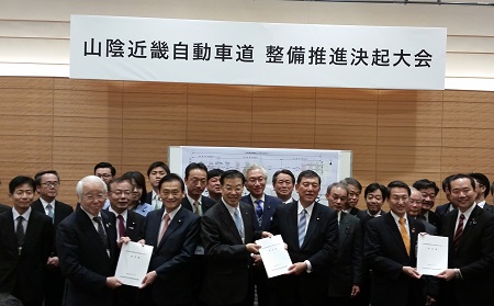 山陰近畿自動車道の早期整備を求めるため、「山陰近畿自動車道整備推進決起大会」(主催:山陰近畿自動車道整備推進議員連盟、山陰近畿自動車道整備推進協議会)が11月24日、近畿の府県知事・市町村長9名、国会議員11名他、総勢約220名の出席の下、都内で開催され、末松副大臣、藤井政務官が出席しました。