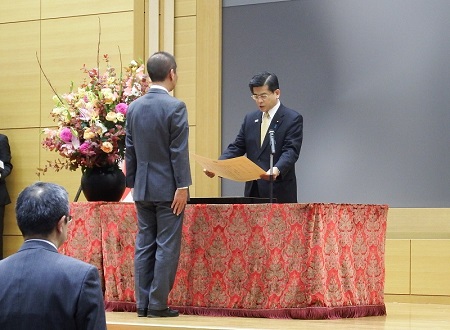 TEC-FORCE代表者へ表彰状を授与する石井大臣