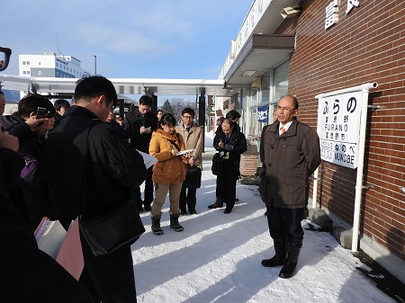 JR富良野駅でぶら下がり取材に応じる根本政務官
