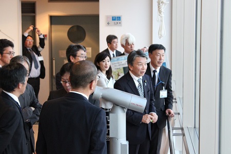 午後には、津松阪港海岸において、工事箇所の松を地元小学校や自治会等と協働して植樹する取組み等の説明を受け、事業実施状況を視察した後、東海環状自動車道の大安IC予定地付近にて工事の進捗状況を、四日市港では、臨港道路霞4号幹線の整備状況等を四日市港ポートビル及び船上より視察しました。