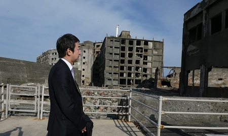 軍艦島(端島)の施設状況について視察する田中副大臣