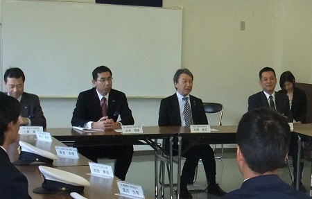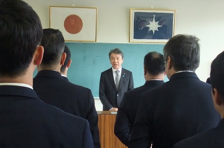 比田勝海上保安署職員を激励する大野政務官