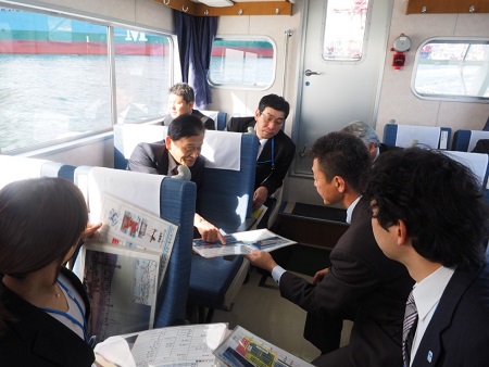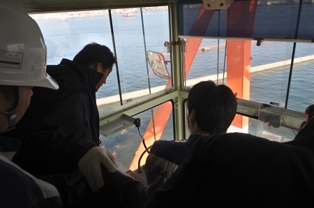 末松副大臣は、神戸港PC18コンテナターミナルについて概要説明を受けた後、ガントリークレーン操作状況を視察しました。また、港湾業務艇にて阪神港(神戸港・大阪港)を海上から視察しました。