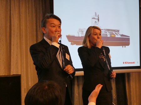 セミナーの冒頭に、川崎重工業(株)がノルウェー船社から受注した海洋資源開発用のオフショア作業船の起工セレモニーが行われ、ノルウェーと日本との協力の象徴として、ノルウェー王国メーラン貿易産業大臣と大野政務官が建造開始の合図をしました。