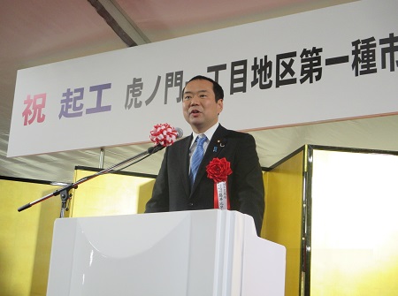 藤井政務官は祝辞の中で、「虎ノ門一丁目地区第一種市街地再開発事業は、国家戦略特区のリーディング事業であり、交通結節拠点となるバスターミナル整備、グローバルビジネスセンター、国際ビジネス拠点を創出する事業になります。本事業により、虎ノ門地域が、東京の新たな都心、国際ビジネスセンターとして、富を創出し、日本の経済を再生し、景気回復を牽引されますよう、心よりご期待申し上げます」と述べました。