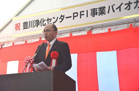 根本政務官は、2月1日、愛知県豊橋市で行われた「豊川浄化センターPFI事業バイオガス発電起電式」(主催:愛知県、豊川流域下水道推進協議会、愛知クリーンエナジー(株))に出席しました。