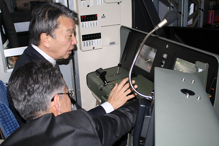 運転シミュレータについて説明を受ける大野政務官