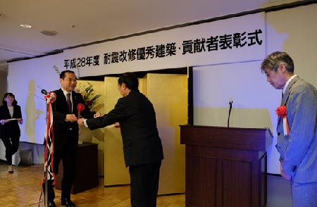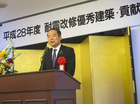 藤井政務官は挨拶の中で、「今回の受賞は、建築物の安全性確保に真剣に取り組まれてこられたご努力の賜であり、建築物の耐震化のモデルとなるものです。今後とも、トップランナーとして我が国における建築物の耐震化をリードして頂けますよう、お願い申し上げます。」と述べました。