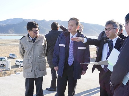 北上川河口部復旧・復興事業の視察を行う末松副大臣