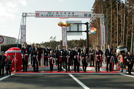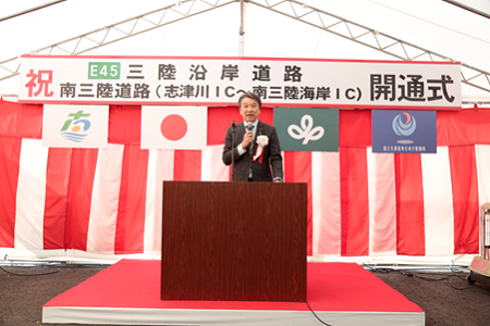 大野政務官は、挨拶の中で、「本道路の開通は、南三陸町の豊かな水産物の輸送等にも大きな効果を発揮でき、より一層まちの活性化に繋がるものと期待している。これからも、ご地元の皆様とともに、一日も早い復興に向け、三陸沿岸道路の全線開通に向けて努めていく」と述べました。