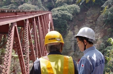 阿蘇長陽大橋の復旧状況を視察する石井大臣