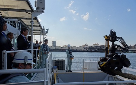 大野政務官は、平成29年4月28日(金)に、名古屋港にて、中部地方整備局所属の海洋環境整備船「白龍」及び大型浚渫兼油回収船「清龍丸」を視察し、漂流ゴミの回収、航路浚渫、油流出事故対応等の業務について説明を受けました。
